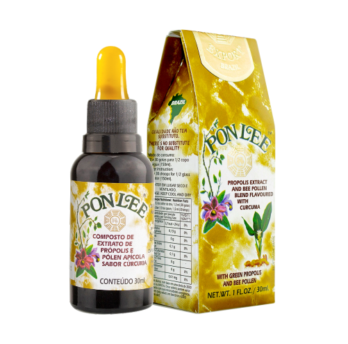 O Extrato de PRÓPOLIS & PÓLEN COM CÚRCUMA PON LEE é elaborado a partir de Extrato de Própolis Verde, enriquecido com Pólen Apícola Silvestre e Cúrcuma, com dinamismo e equilíbrio exclusivos desenvolvidos por Sunyata P. A. Ltda., sendo o Pólen e a Própolis provenientes de regiões isentas de agrotóxicos.